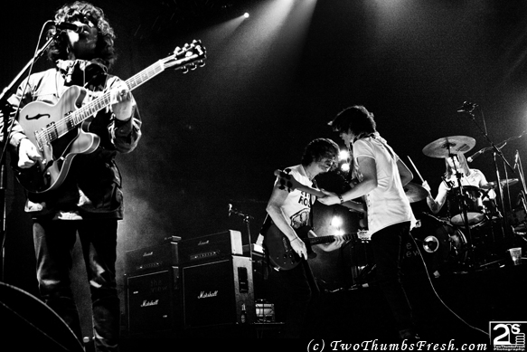 ‘You having a good time?’ from Kieren is probably the euphemisim of the year. The next song is the sweet melodic ballad ‘The Don’ followed by the ecstatic delight of ‘Temptation Dice’. Kyle’s voice is beyond belief tonight, dipping and soaring like some untamed wild thing on its own emotional trajectory. ‘Treeeaat!’ in the final chorus reaches for the rafters and beyond. After this, Kieren takes the lead. He seems to feel the need to apologise for this,as if too aware that people prefer Kyle at the front. But it’s not true as ‘One Off Pretender’ and ‘Skag Trendy’ are firm favourites. He dedicates the former appropriately enough to his mum on the balcony. Drummer Steven Morrison goes straight from ‘One Off’ into ‘Skag Trendy’ – a song never more pertinent with more skag trendies around than ever before.